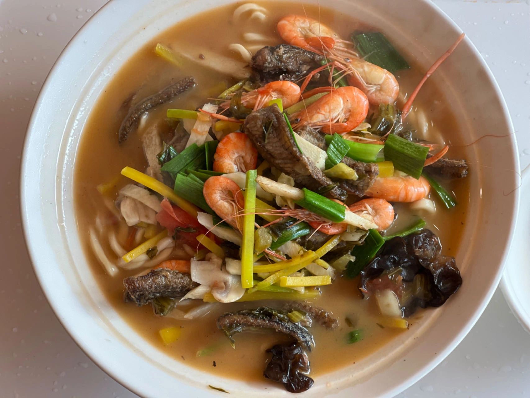 Saxia Noodles, or “Three Shrimp Noodles,” is a traditional noodle dish from Suzhou, a city famous for its canals, classical gardens, and refined cuisine. The name “Sanxia” (三虾) refers to three parts of river shrimp: shrimp meat, shrimp roe, and shrimp brain — all delicately stir-fried to create a rich, golden topping